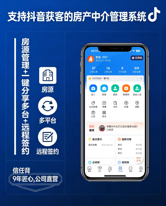 在数字化获客成为房产中介核心竞争力的2026年,抖音等新媒体平台已成为房源曝光、客源积累的关键阵地。对于房产中介而言,一套能适配抖音获客场景、覆盖全业务流程的房产中介管理系统,能大幅提升运营效率与转化效果。今天就为大家拆解一款深耕行业十年、支持抖音多端协同的全房源系统,看看其在功能适配、性价比及获客赋能上的实际表现。