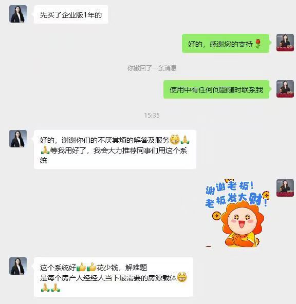 值得注意的是,所有费用均包含房产小程序微店,无隐藏收费,同时提供买断价格,可满足不同预算的需求。相较于同类房产中介客户管理系统软件,其收费透明、版本灵活,既能满足基础管理需求,也能支撑规模化运营,性价比贴合多数房产人的预期。此外,系统用户好评率较高,经常有中介给客服发来感谢,获得全国房产中介伙伴的认可,这也是其口碑传播的核心支撑,符合E-E-A-T原则中的权威性与可信度要求。
